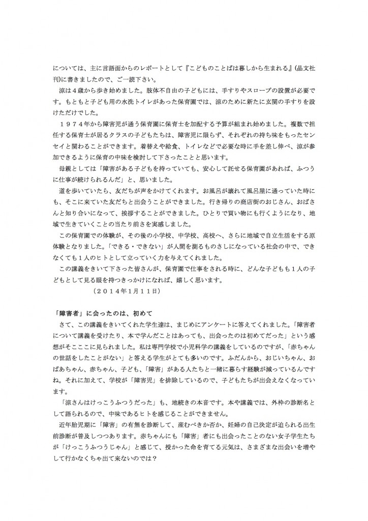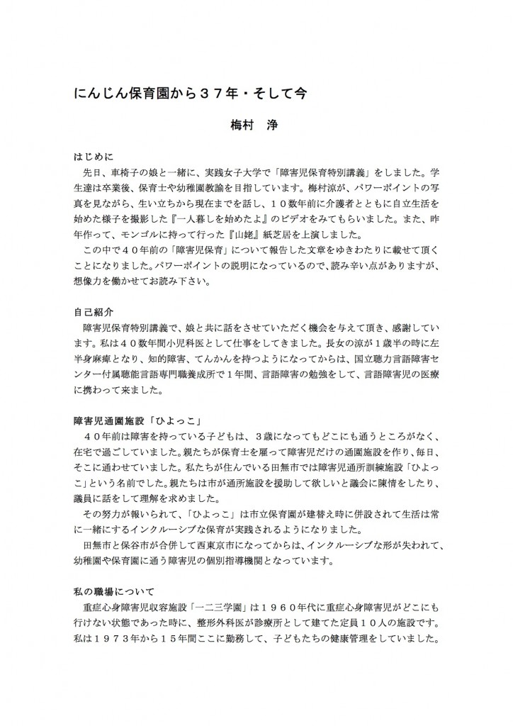 2014年2月12日 / 最終更新日時 : 2021年3月23日 ki-ki- お知らせ にんじん保育園から37年・そして今 1月7日に実践女子大学で「にんじん保育園から37年・そして今」というタイトルで保育士、幼稚園教諭志望の学生達に特別講義の時間を設けていただきました。その時の記録を子ども問題研究会の機関誌に書きましたのでアップします。
